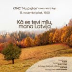 13. novembrī, plkst. 19.00 Mazās ģildes Lielajā zālē aicinām uz koncertu “Kā es tevi mīlu, mana Latvija”. Savu veltījumu Latvijai izdziedās un izspēlēs KTMC “Mazā ģilde” sieviešu koris “Ausma” (mākslinieciskā vadītāja Vita Grīnhofa) , koklētāju ansamblis “Kokļu klubs” un BJC Skolēnu pils koklētāju ansamblis “Austriņa” (mākslinieciskā vadītāja Iveta Tauriņa). Koncertā skanēs latviešu un igauņu komponistu…